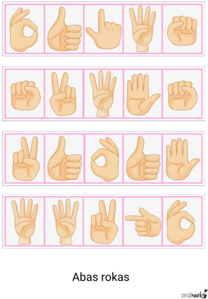 Materiālā pieejamas 9 plaukstu/pirkstu vingrinājumu kartītes kā arī 24 vingrinājumu kartīšu slejas kreisajai, labajai un abām rokām kopā.