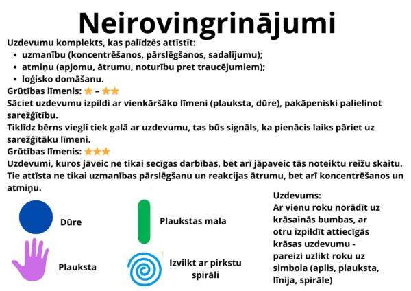 Ar vienu roku norādīt uz krāsainās bumbas, ar otru izpildīt attiecīgās krāsas uzdevumu – pareizi uzlikt roku uz simbola (aplis, plauksta, līnija, spirāle)