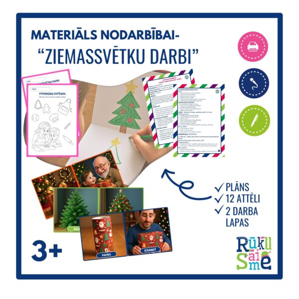 Mācību materiāls “Ziemassvētku darbi” paredzēts pirmsskolas vecuma bērniem no 3 gadiem un palīdz bērniem saprotamā, rotaļīgā veidā iepazīt Ziemassvētku gaidīšanas laiku, Adventes nozīmi un labos darbus ikdienā. Materiāls veicina bērnu izpratni par to, ko cilvēki dara pirms Ziemassvētkiem – cep piparkūkas, rotā eglīti un telpas, aizdedz sveces, gatavo apsveikuma kartītes, palīdz citiem un rūpējas par apkārtējo vidi.