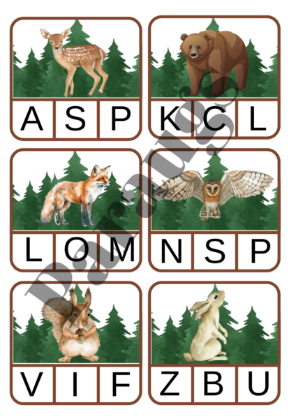 Šīs kartītes ir paredzētas pirmsskolas vecuma bērniem, lai attīstītu fonemātisko apziņu un veicinātu lasītprasmes iemaņas. Katras kartītes priekšpusē ir attēls (Stirna, Ezis, Lapsa), un bērniem jānosaka pirmā skaņa attēlotajā vārdā. Kad pirmā skaņa ir identificēta, bērns to atzīmē, uzliekot knaģi, pogu vai akmeni uz pareizās vietas uz kartītes. Šis uzdevums palīdz nostiprināt skaņu un burtu atpazīšanu, veicinot valodas un runas prasmes agrīnā vecumā.