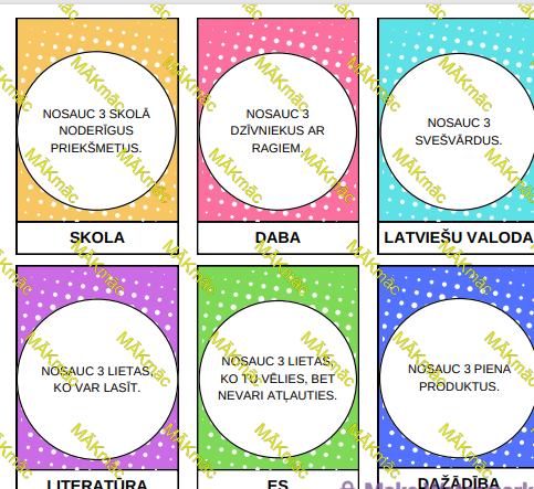 Kartītes var izmantot dažādi, piemēram, katrs skolēns velk pa 1 kartītei un 5 sekunžu laikā mēģina nosaukt prasīto, ja tas izdarīts, tad punkts tiek piešķirts, ja laikā neiekļaujas – punktu nepiešķir. Pirms lietošanas tās jāizprintē krāsainas un jāsagriež.