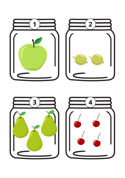 2. Uzdevuma mērķis – salikt katrā burciņā tik daudz ogu vai augļu, cik norādīts uz vāciņa (piemēram, burkā ar skaitli “3” jāieliek 3 ogas).