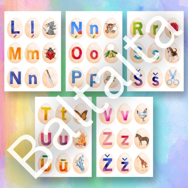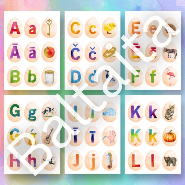 Katrā kartītē attēlots cits lielais vai mazais alfabēta burts, vai attēls, kurš sākas ar šo burtu.
