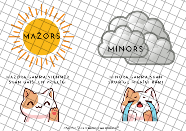 Atgādne tematam “Kas ir mažors un minors?” Ietver vizuālu definīciju attēlojumu.