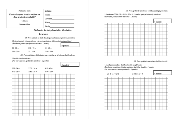 Šajā pārbaudes darbā skolēni parādīs prasmi reizināt un dalīt daudzciparu skaitļus ar divciparu skaitļiem. Uzdevumi veidoti, lai pārbaudītu izpratni par darbību secību, skaitļu sadalīšanu un aprēķinu precizitāti. Darbs palīdzēs nostiprināt prasmes, kas nepieciešamas ikdienas situācijās, kur jāveic sarežģītāki aprēķini.