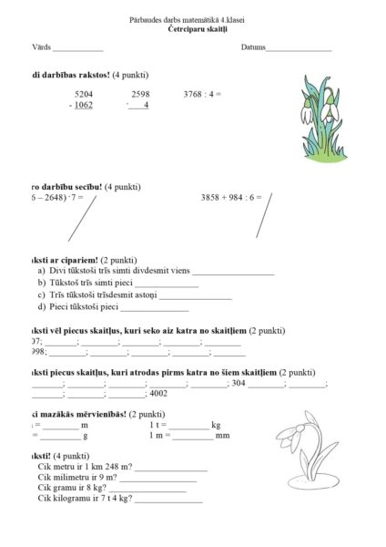 Pārbaudes darbs matemātikā 4.klasei Četrciparu skaitļiPārbaudes darbs matemātikā 4.klasei Četrciparu skaitļi