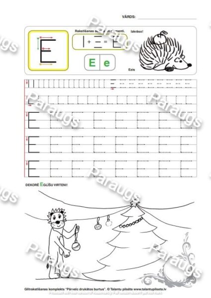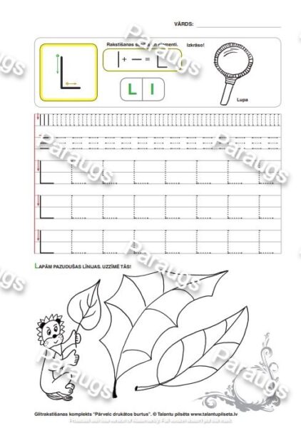 ZM apstiprinātie LV drukātie burti. Burta pareizrakstība – burta elementi, burta rakstīšanas virzieni un secība, asociatīvs zīmējums, burta elementu treniņš, burti, kas jāpārvelk, praktiskais uzdevums.