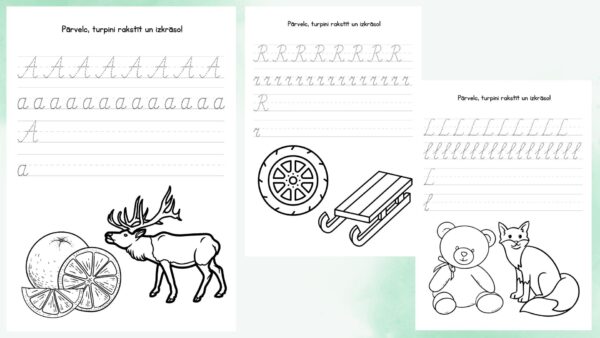 Pārvelc, turpini rakstīt un izkrāso, visi alfabēta burti, katram attiecīgs krāsojams attēls.