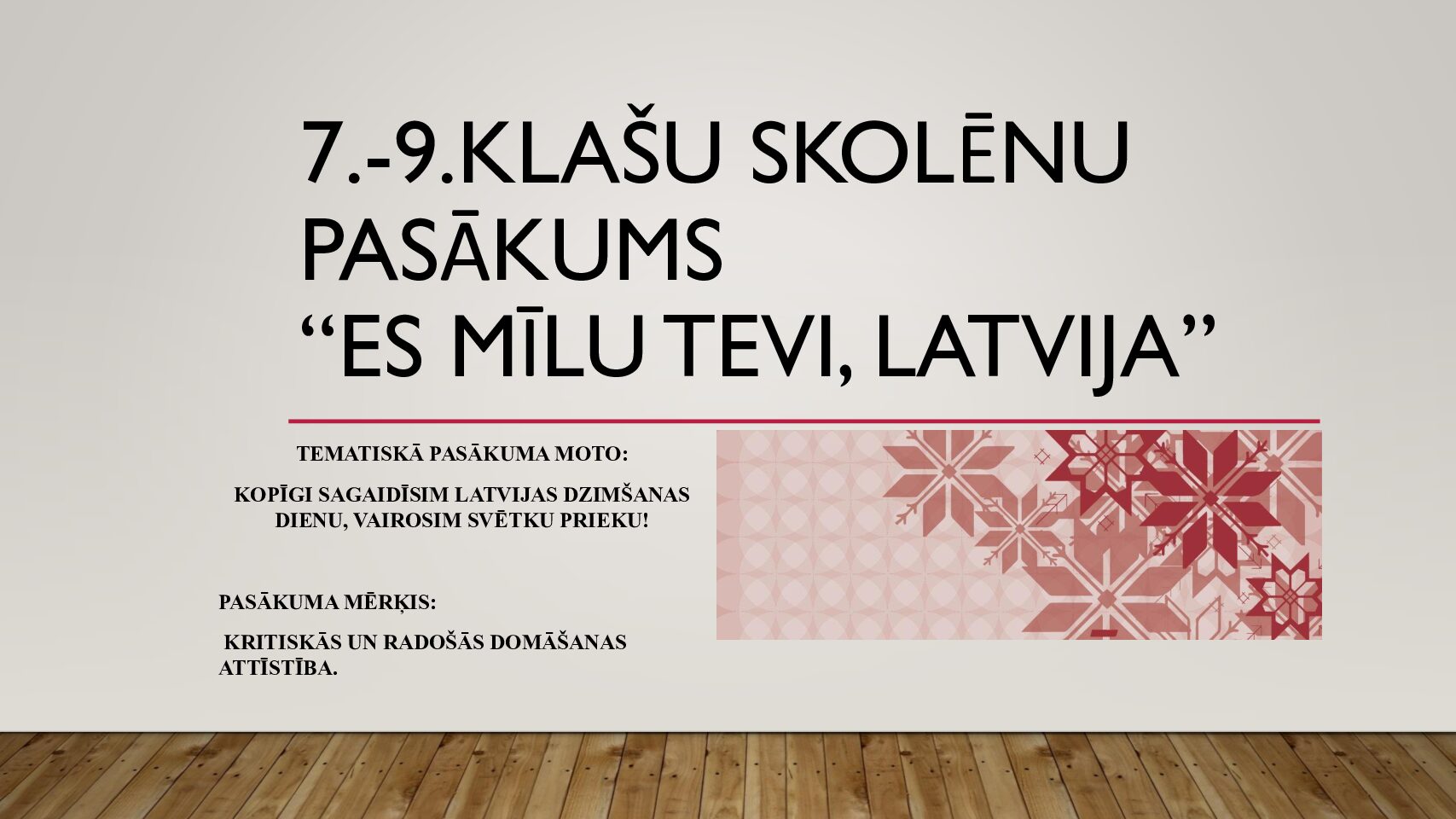Patriotiskās nedēļas ietvaros, tiek piedāvāts materiāls 7.-9.klašu skolēniem pasākumam “Es mīlu Tevi, Latvija”-norises scenārijs,