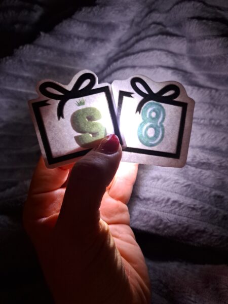 Paspīdini ar lukturīti vai gaismiņu no dāvaniņas apakšas un atrodi burtu.Nosauc burta skaņu, izdomā vārdu,kas sākas ar šo burtu.Apraksti,kādā krāsā ir burts,kāda tam ir tekstūra vai ko tas atgādina.