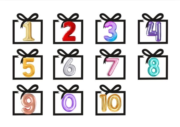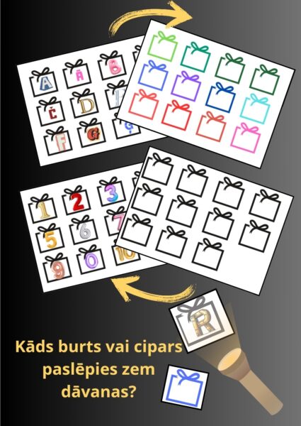 2.Salīmē kopā burtu un dāvanu lapas .Krāsainās dāvanas paredzētas burtiem.Melnbaltās – cipariem.