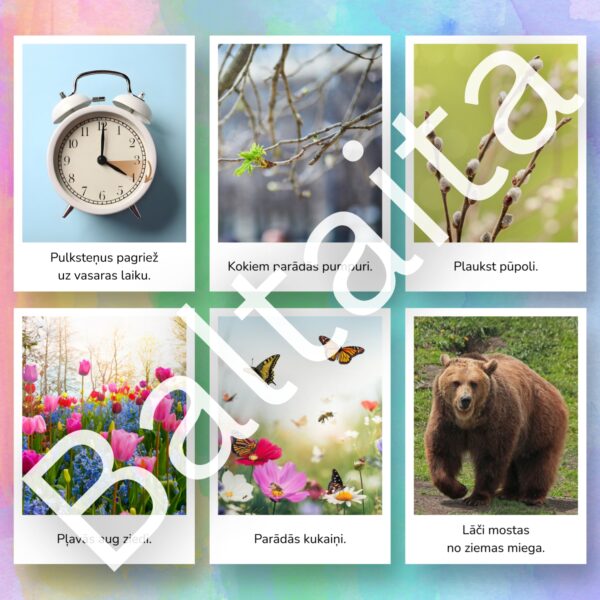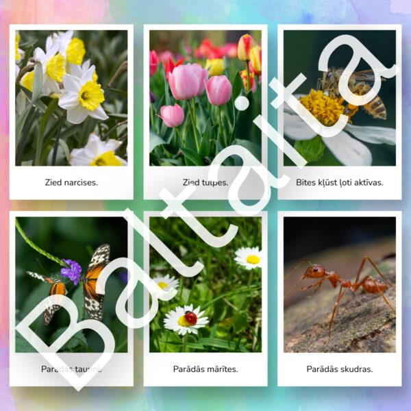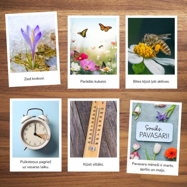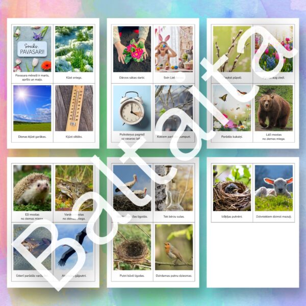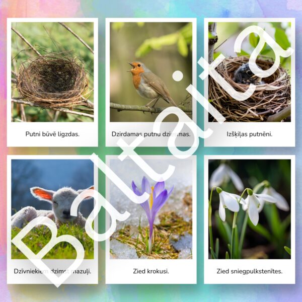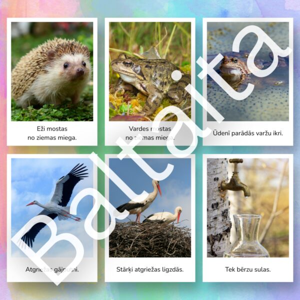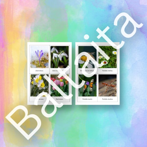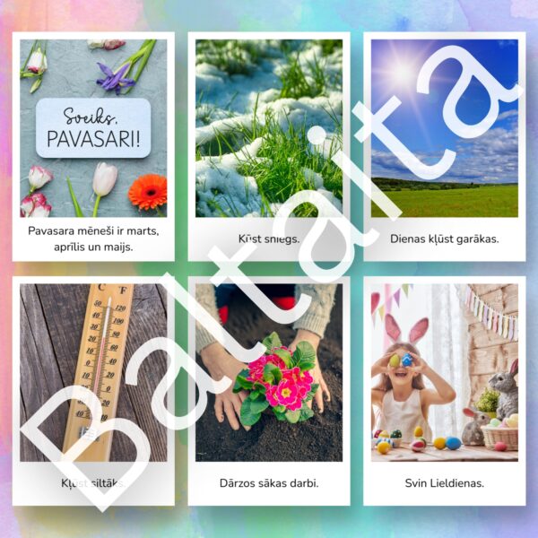 Iepazīstiniet bērnus ar dabas atmošanos izmantojot šīs skaistās un informatīvās vizuālā atbalsta kartītes. Šis materiāls ir lielisks palīgs pirmsskolas un sākumskolas vecuma bērniem, lai mācītos atpazīt sezonālās izmaiņas dabā, paplašinātu vārdu krājumu un veidotu izpratni par apkārtējo vidi.