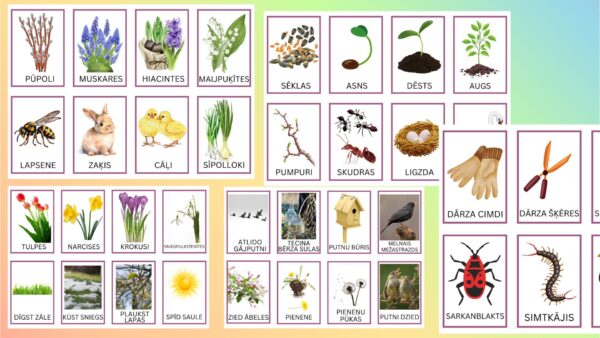 9 lapas ar pavasarīgām attēlu kartītēm vārdu grozam, vārdu krājuma paplašinājumam, pavasara aktivitātēm.