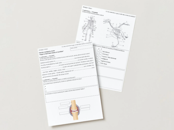 Darbs sastāv no 7 uzdevumiem, iekļauti temati par muskuļu, kaulu un kaulu savienojumu uzbūvi, cilvēka un dzīvnieka skeletu salīdzinājumu, organismu balsta veidiem, augu balstu, kā arī balsta un kustību orgānu sistēmas veselību un traumām.