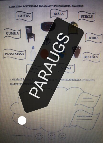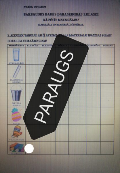 Aizpilda tabulu- ar x atzīmē kādas materiālu īpašības piemīt dotajiem priekšmetiem- elastīgs, plastisks, mīksts, caurspīdīgs, izturīgs, lokans. Savieno- no kāda materiāla izgatavoti priekšmeti- papīrs, māls, stikls, koks, metāls, vilna, āda, plastmasa, gumija. Zīmē vienu priekšmetu, raksta no kāda materiāla un kādas materiālu īpašības tam piemīt.