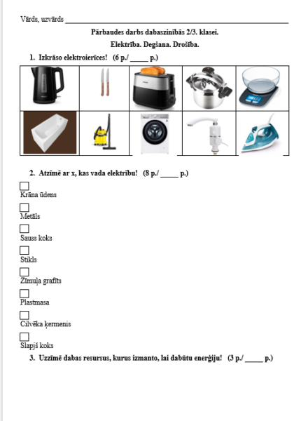 PIEDĀVĀJU PĀRBAUDES DARBU DABASZINĪBĀS 2/3.KLASEI – ELEKTRĪBA. DEGŠANA. DROŠĪBA.