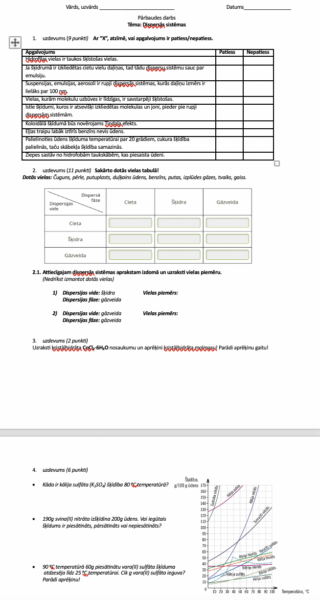 PD “Dispersās sistēmas”, PD var izmantot dabaszinību kursā 10., 11., 12. klasei. Tajā ietverts tests par dispersajām sistēmām, hidrofilām un hidrofobām vielām, Tindala efektu, uzdevumi, kuros jāprot noteikt dispersijas vide un fāze, kā arī dažādi aprēķinu uzdevumi.