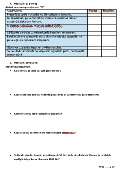 PD “Kā izmanto gāzes un šķidrumus ierīcēs ?” 7.klasei Inženierzinību priekšmetā. Pārbaudes darbā iekļauti jautājumi par gāzu un šķidrumu īpašībām. Pārbaudes darbs veidots vairāk testa veidā, jo vērtējums šajā tēmā veidojas no šī PD un praktiskā darba – mašīnas modelis.