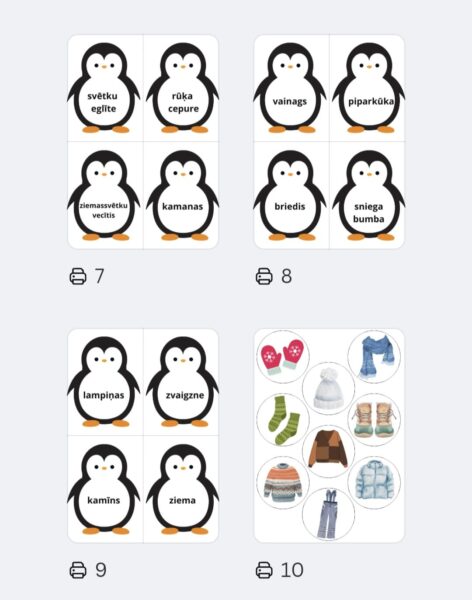 Materiālā ir 36 pingvīnu kartītes. Uz vienas lapas četri attēli. Vārdi  par ziemu un ziemassvētkiem.