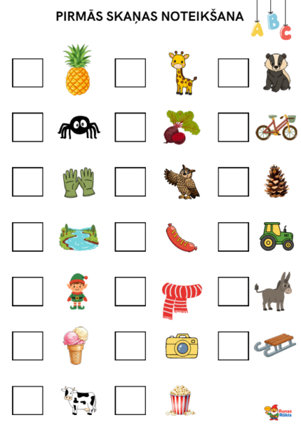 Materiālā iekļauts: materiāls ar 5 lapām pirmās skaņas noteikšanai + materiāls ar attēliem un burtiem (katrai skaņas noteikšanas lapai klāt attēli) (kopā 15 lapas).