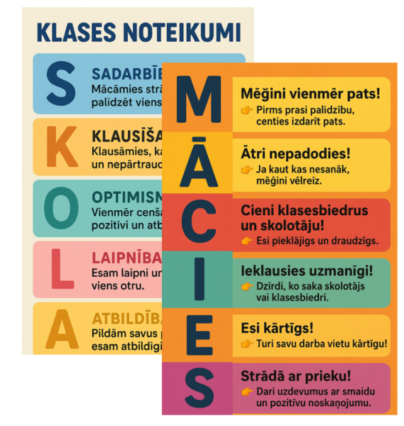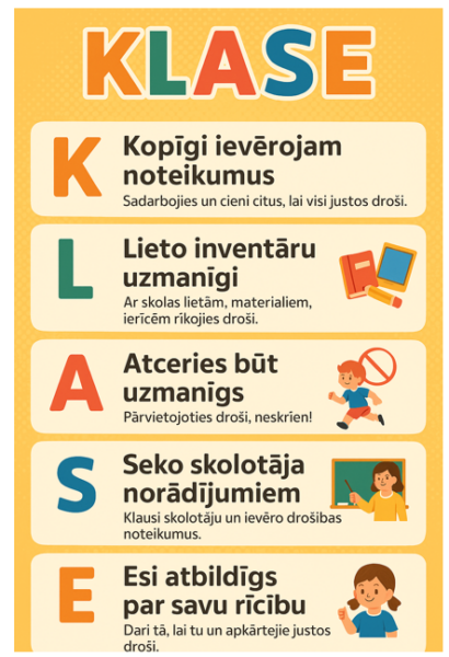 Krāsaini un saprotami drošības noteikumi skolā un klasē.
