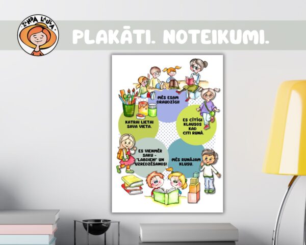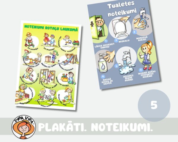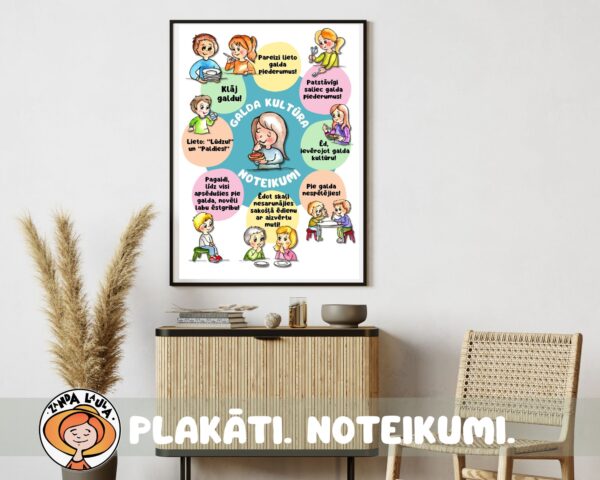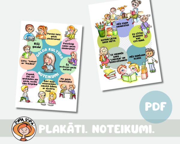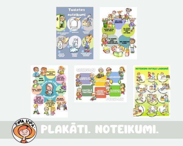 - Plakāti – Galda kultūra – noteikumi, Tualetes noteikumi, Noteikumi rotaļu laukumā, grupiņas noteikumi, caurviju prasmes;
