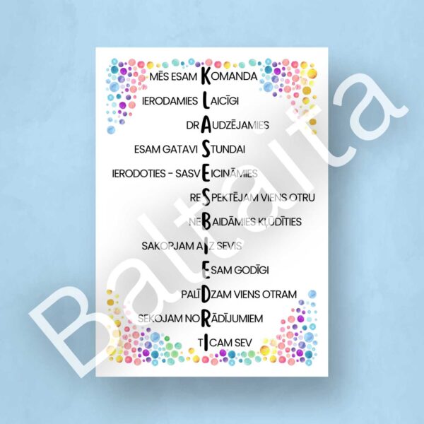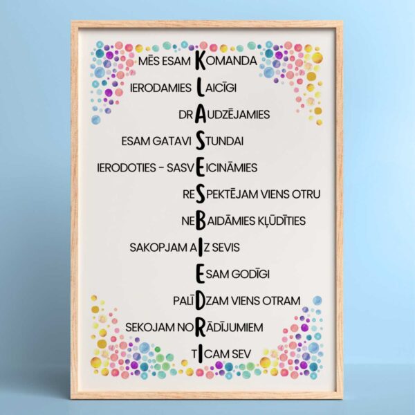 Lieliski iederēsies jebkurā mācību telpā un izskatīsies labi kopā ar Klases noteikumi – plakāts.