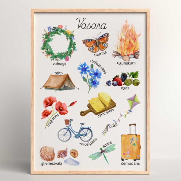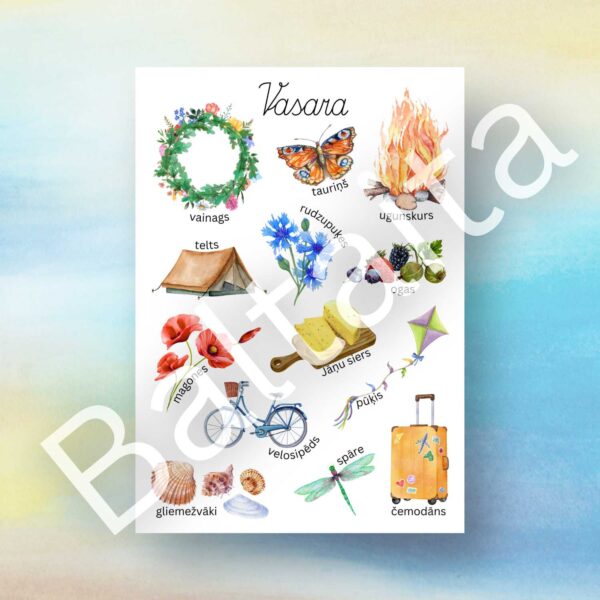Vasaras plakāts ar krāsainiem attēliem un to nosaukumiem.