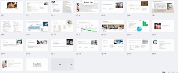 Prezentācijā iekļauta informācija par ievadu, trīs nodaļām (pētīšana, plānošana, ieviešana), secinājumiem un priekšlikumiem. Darbs papildināts ar piemēriem. Sniegta arī informācija par to kā “palīdz” ChatGPT, ja darba rakstīšanu vēlas uzticēt tam. Skolā tika organizēta ideju prezentēšana, kas kalpoja arī kā plānoto aktivitāšu saskaņošana ar skolas vadību un starpaizstāvēšana, lai katrs var novērtēt savu virzību uz mērķi. Ir informācija par “mazo” prezentāciju un gala prezentācijas sagatavošanu. Prezentācijā kopā ir 23 slaidi.
