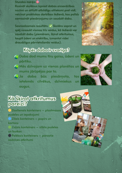 Šis mācību materiāls ir paredzēts sākumskolas skolēniem, lai viņi izprastu vides aizsardzības nozīmi un apgūtu praktiskus veidus, kā ikdienā saudzēt dabu. Materiālā ietilpst vizuāli pievilcīga prezentācija ar vienkāršu un saprotamu informāciju, attēliem un praktiskiem piemēriem, kā arī interaktīvs grupu darbs, kas palīdz skolēniem nostiprināt iegūtās zināšanas caur diskusijām un situāciju analīzi.