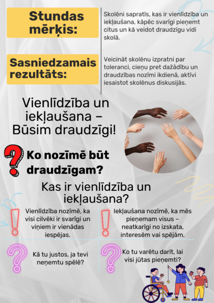Šī interaktīvā prezentācija sākumskolas skolēniem palīdz saprast vienlīdzības un iekļaušanas nozīmi, veicinot draudzību un savstarpējo cieņu skolā. Materiāls ietver: