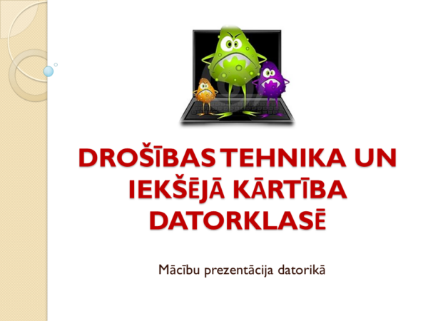 “Drošības tehnika un iekšējās kārtības noteikumi datorklasē” 40 rediģējami pptx slaidi ar drošības noteikumiem, kas papildināti ar attēliem.