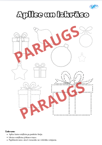 Darba mērķis – rosināt bērnos radošo domāšanu, veicināt uzmanības koncentrāciju un attīstīt smalko motoriku, izmantojot Ziemassvētku tematikas uzdevumus. Tas ir piemērots pirmsskolas un sākumskolas vecuma bērniem kā rotaļīgs mācību materiāls svētku laikā.