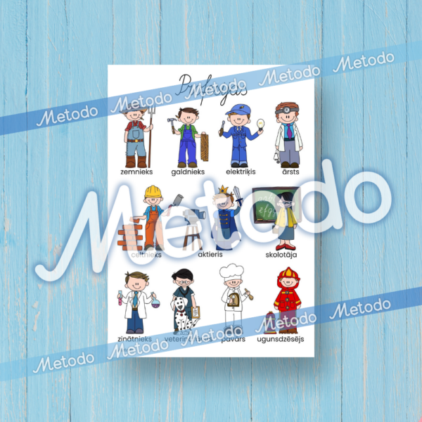 Krāsains plakāts ar dažādu profesiju pārstāvju attēliem un profesiju nosaukumiem.