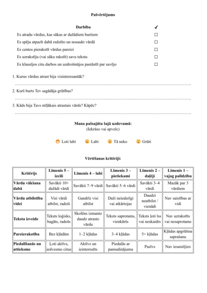 Projekta darbs latviešu valodā un literatūrā 1. – 3. klase. Mērķis, uzdevumi, darbību izpildes soļi, apkopojuma laukumi,  skolēnu pašvērtējuma kritēriji un kritēriji darba novērtēšanai