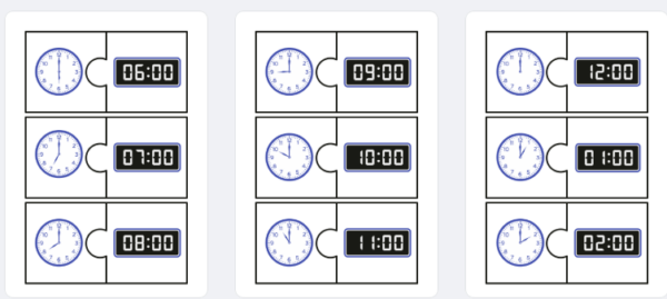 Puzle- savieno analogo un digitālo pulksteni. Pilnas stundasPuzle- savieno analogo un digitālo pulksteni. Pilnas stundas