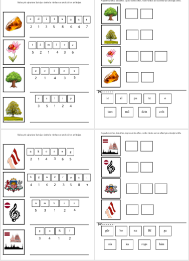 • izlasi zilbes, izgriez, veido vārdu un ielīmē pie attiecīgā  Latvijas simbola attēla.