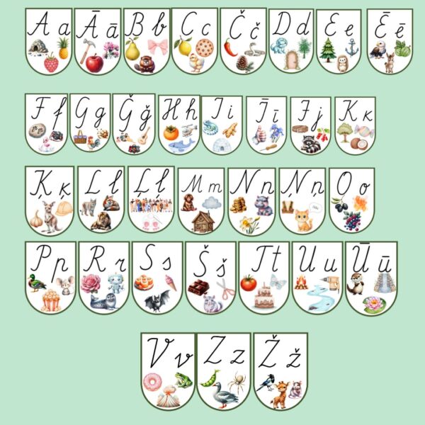 33 burti, katram burtam 3 attēli ( izņemot Ļ un Ņ), A4 formāts.