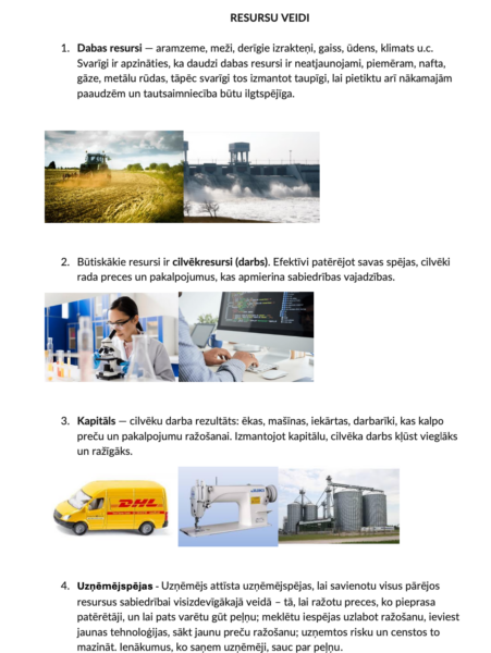 Atgādne par četrām ražošanas resursu grupām un divi uzdevumi, kurus var novērtēt ar procentiem.