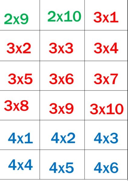 Reizrēķina kartītes 100 apjomā. Uzdevums -savienot reizrēķina kartīti ar rezultāta kartīti, kura ir atšķirīgā krāsā. Var izmantot apgūstot reizrēķinu, Var arī rezultāta kartīti uzlīmēt aizmugurē reizrēķina kartītei- tad bērns varēs mācīties pats, vai izmantot paškontrolei.