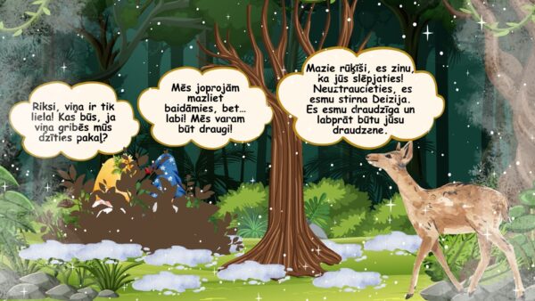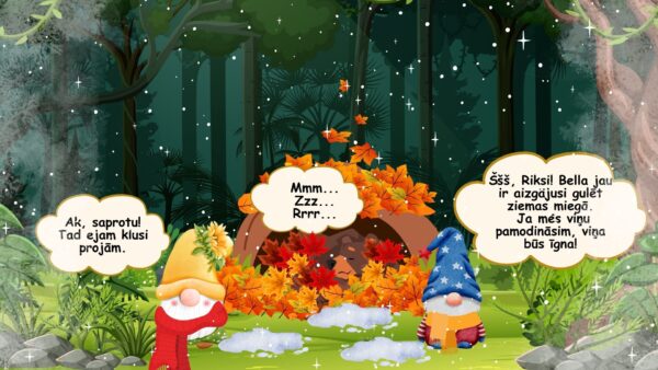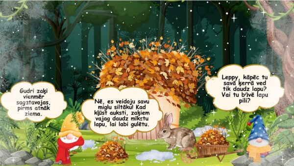 💬 Dialogos balstītais stāsts palīdz bērniem iepazīt vēlā rudens norises dabā un sagatavošanos ziemai, bagātina vārdu krājumu, rosina domāt un veicina cieņpilnu attieksmi pret dabu un draudzību. Dzīvespriecīgās sarunas ar humora dzirksti padara mācību procesu aizraujošu un bērniem viegli uztveramu.