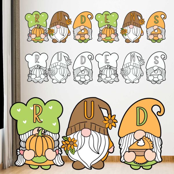 Katram rūķim uz cepures ir burts lai kopā tie izveidotu uzrakstu RUDENS.