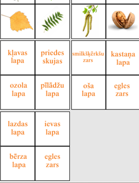 Uzdevums – iziet ar bērniem ārā un pēc attēliem sameklēt attiecīgos dabas materiālus, uzlikt uz attiecīgās kartītes, atpazīt, izlasīt doto vārdu. Pilnveidot prasmi lasīt.