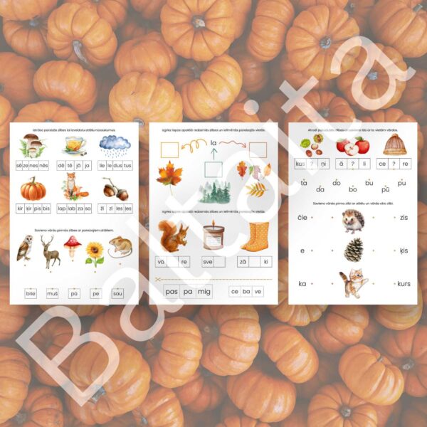 Darba lapas rudens tematikā ar uzdevumiem par zilbēm.