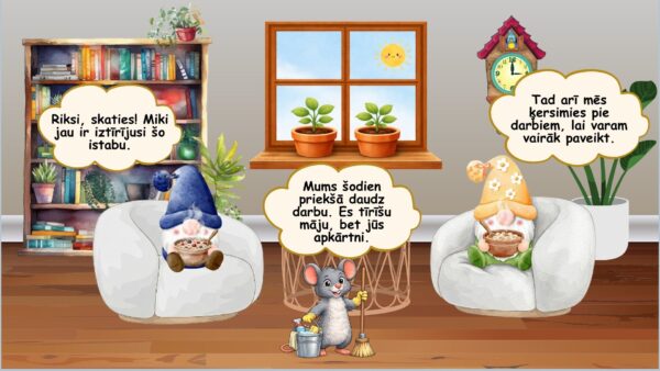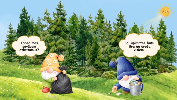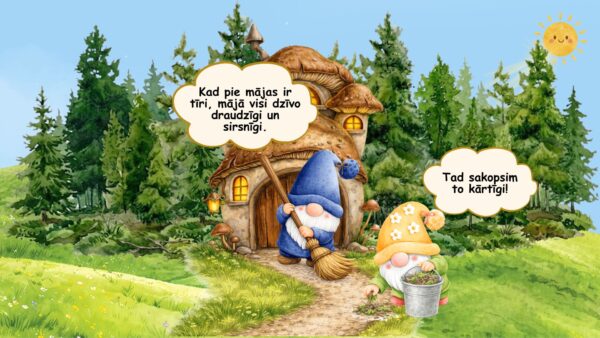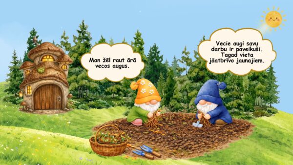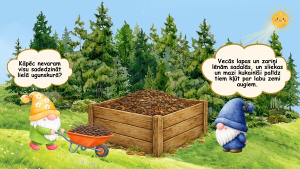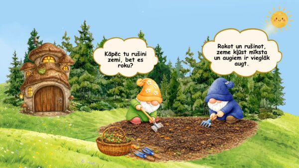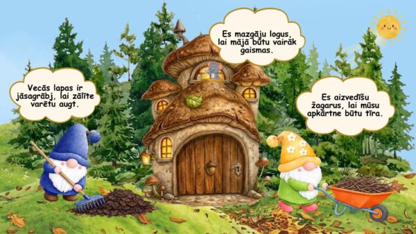 🎯 Izglītojošie mērķi. Veidot pirmsskolas vecuma bērniem izpratni par rūpēšanās un darba tikuma nozīmi, attīstīt klausīšanās un dialoga uztveres prasmes, veicināt notikumu secības izpratni, rosināt atbildības sajūtu par tuvāko vidi gan mājās, gan dabā un stiprināt izpratni par kopīga darba nozīmi.