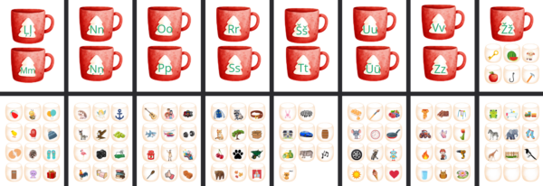 Saklausa pirmo skaņu vārdā un atrod atbilstošu burtu. Ievieto krūzītē attēlus, kas sākas ar atbilstošo burtu.