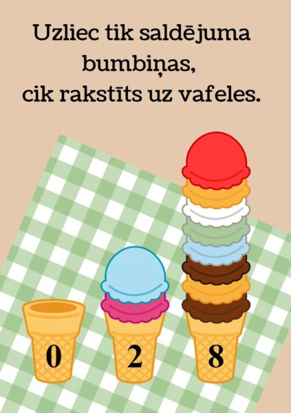 1 lapa ar tukšām saldējuma bumbiņām skaitīšanai-izdrukāt uz krāsainā papīra( nepieciešamas 4 lapas)