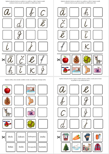 • Prasme izgriezt zemāk redzamos attēlus, noteikt pirmo skaņu un pielīmēt tos pie atbilstošā burta.