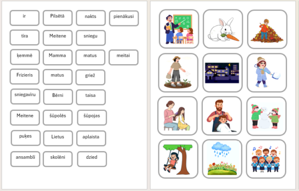 Kartīšu materiāls teikumu veidošanai un lasītā izpratnei. Pavisam iespējams izveidot 24 teikumus no mazajām kartītēm. Katram izveidotajam teikumam atbilst attēla kartīte.