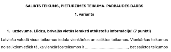 Iekļauti uzdevumi par tēmai raksturīgo jēdzienu izpratni, uzdevums, kur jānosaka gramatiskie centri, uzdevums, kur jāatrod vienlīdzīgu teikuma locekļu grupas, vairākos uzdevumos jāliek komati (iekļauti arī gadījumi, kur pirms “kā” jāliek/ nav jāliek komats, un gadījumi, kur komatos jāliek visbiežāk lietotie iespraudumu gadījumi; lūdzu, to ņemt vērā un, ja nepieciešams, pielāgot uzdevumus). Beigās radošs uzdevums, kurā aizcināts izteikt viedokli/ rakstīt pārdomas.